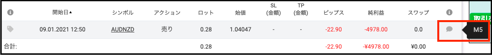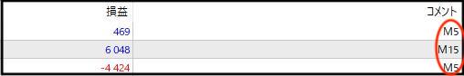 MT5の「ツールボックス」→「タブの上で右クリック」→「表示列」→「コメント」に✅をつけていただきますと以下のように表示されどの時間足が基準となりエントリーされたのか確認できます。