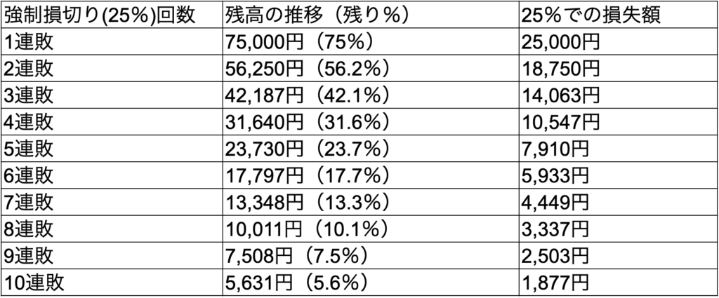 デフォルト設定の25%損切りということは4連敗で資金は0になってしまうということでしょうか?